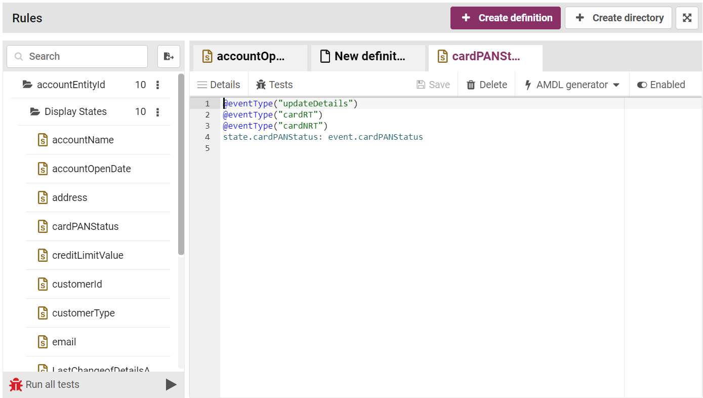 Using the Rule Builder interface in the Fraud Transaction Monitoring Portal you can add AMDL expressions. The Fraud Transaction Monitoring Portal also includes a set of for rules, represented as folders. To help you save time in rule building, Fraud Transaction Monitoring Portal includes the accountEntityId and the cardEntityId folders that contain pre-configured rules.