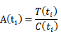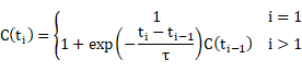 The following equation shows the value of a rolling average for the ith update of the expression (which happens at time ti) is calculated as the ratio of the exponentially decayed totalT, and countC :