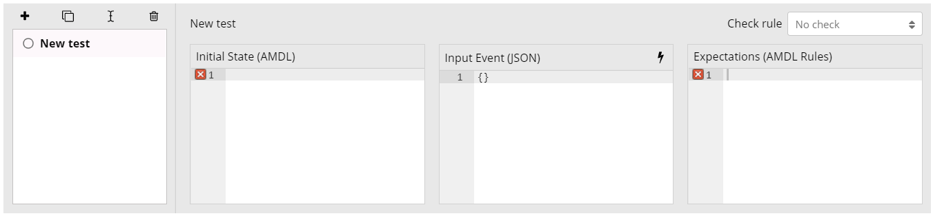 A test consists of a test event, optional tests on some initial state and the final state once the AMDL has been executed. The tests panel looks as follows:
